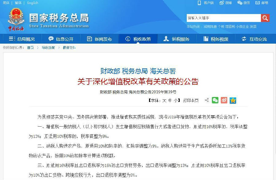 为贯彻落实党中央、国务院决策部署,推进增值税实质性减税,现将2019年增值税改革有关事项公告如下: